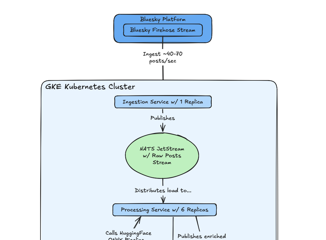 A complete data processing pipeline using NATS JetStream for messaging between microservices, with support for cloud-native Kubernetes deployment on Google Kubernetes Engine (GKE). Features cost-optimized GKE cluster management, real-time sentiment analysis, and a Next.js visualization dashboard. Includes NATS server with JetStream persistence, firehose data ingestion, stream processing with sentiment analysis, and mock data generation for development.